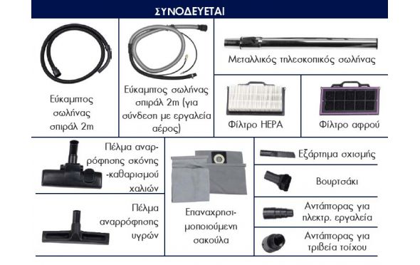 - Κατάλληλη και για ψιλή σκόνη όπως αναρρόφηση σκόνης από τριβεία τοίχου & τριβεία φανοποιίας.