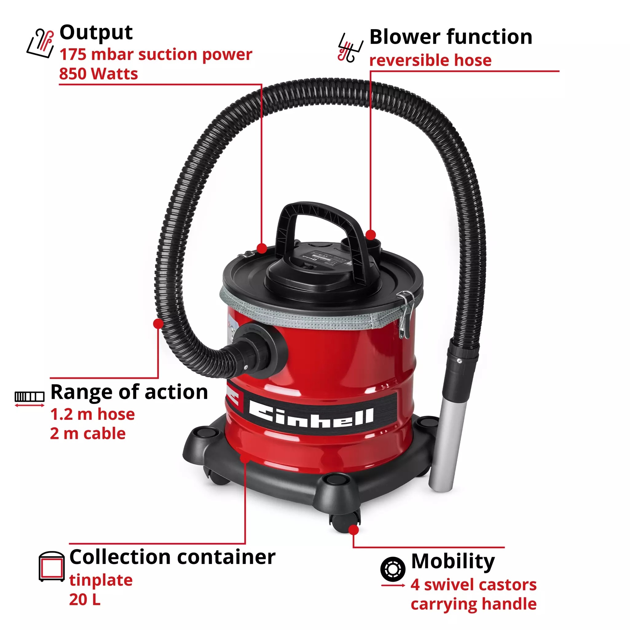 Το πτυχωτό φίλτρο φιλτράρει τη λεπτή σκόνη και τη σκόνη στάχτης. Το προ-φίλτρο αποτρέπει το γρήγορο φράξιμο του πτυχωτού φίλτρου.Μεγάλο δοχείο συλλογής χωρητικότητας 20 λίτρων. Εύκολο άδειασμα του δοχείου χάρη στους ταχυσυνδέσμους ασφάλισης.Ευέλικτη και εύκολη μετακίνηση με 4 περιστρεφόμενους τροχούς. Πρακτική χειρολαβή μεταφοράς για άνετη μετακίνηση. Λειτουργία φυσητήρα για καθαρισμό δυσπρόσιτων σημείων.Για την απομάκρυνση κρύας στάχτης από το τζάκι