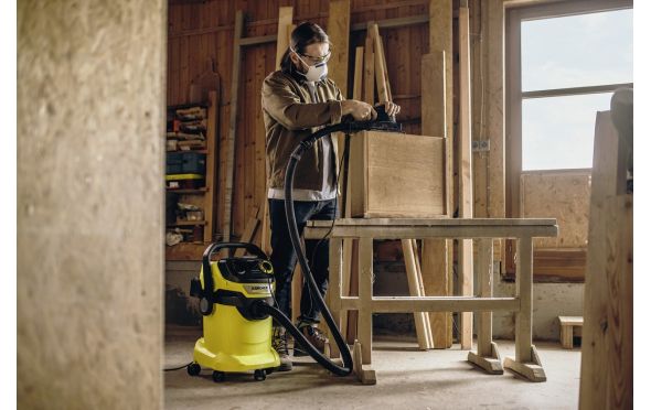 Η ηλεκτρική σκούπα WD 5 P V-25/5/22 για υγρή και ξηρή αναρρόφηση με κατανάλωση ρεύματος 1100 watt επιτυγχάνει τέλεια αποτελέσματα καθαρισμού σε όλους τους τύπους βρωμιάς - είτε στεγνή είτε υγρή, λεπτή είτε χοντρή. Η συσκευή διαθέτει πλαστικό δοχείο 25 λίτρων, καλώδιο 5 μέτρων, εύκαμπτο σωλήνα αναρρόφησης μήκους 2,2 μέτρων, εναλλάξιμο ακροφύσιο δαπέδου, επίπεδο πτυχωτό φίλτρο και σακούλα φίλτρου fleece. Η ενσωματωμένη πρίζα ρεύματος με αυτόματο διακόπτη on/off επιτρέπει τη σύνδεση ηλεκτρικών εργαλείων. Η βρωμιά που προκύπτει από το πριόνισμα ή το τρίψιμο αναρροφάται απευθείας. Ο περιστροφικός διακόπτης μπορεί να χρησιμοποιηθεί για τη ρύθμιση της ισχύος αναρρόφησης όπως απαιτείται. Χάρη στην κατοχυρωμένη με δίπλωμα ευρεσιτεχνίας τεχνολογία αφαίρεσης...