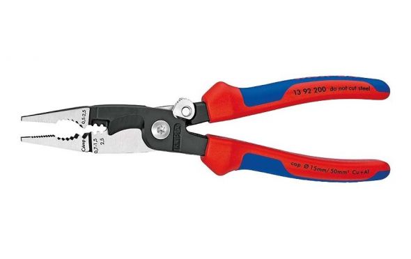 - Τσιμπίδα πολλαπλών λειτουργιών για ηλεκτρολογικές εγκαταστάσεις, για σφίξιμο επίπεδων και στρογγυλών αντικειμένων, λύγισμα, αφαίρεση γρεζιών, κοπή καλωδίων, απογύμνωση και ρυτίδωση των ακροχιτωνίων σύνδεσης κλώνων