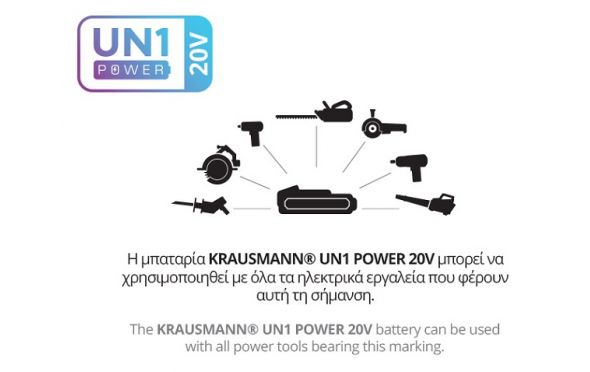 - UN1 POWER - Η μπαταρία KRAUSMANN® UN1 POWER 20V μπορεί να χρησιμοποιηθεί με όλα τα ηλεκτρικά εργαλεία που φέρουν αυτή τη σήμανση.
