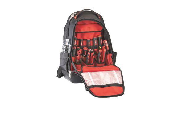 Ανθεκτική κατασκευή, κατασκευασμένη από βαλλιστικό νάιλον 1680D.Σκληρή φορμαρισμένη βάση επιτρέπει στο σακίδιο να στέκεται όρθιο και προσφέρει μέγιστη προστασία παντός καιρού.Μεγάλος αποθηκευτικός χώρος: 35 τσέπες στο σύνολο.Αναδιπλούμενη μπροστινή τσέπη για εύκολη πρόσβαση και αποθήκευση μεγαλύτερων αντικειμένων.Μεγάλες αποθηκευτικές δυνατότητες: Κάθετα αποθήκευτρα εργαλείων μεγιστοποιούν τον αποθηκευτικό χώρο.Αναδιπλούμενη μπροστινή τσέπη.Πλευρική θήκη για μπουκάλια.Πλατιά εμπρόσθια λουριά συγκράτησης.Εξωτερικά άγκιστρα των φερμουάρ επιτρέπουν επιπλέον αποθήκευση.Θήκη laptop: Διαθέτει προστατευμένο αποθηκευτικό χώρο για laptop/tablet και προσωπικά αντικείμενα.