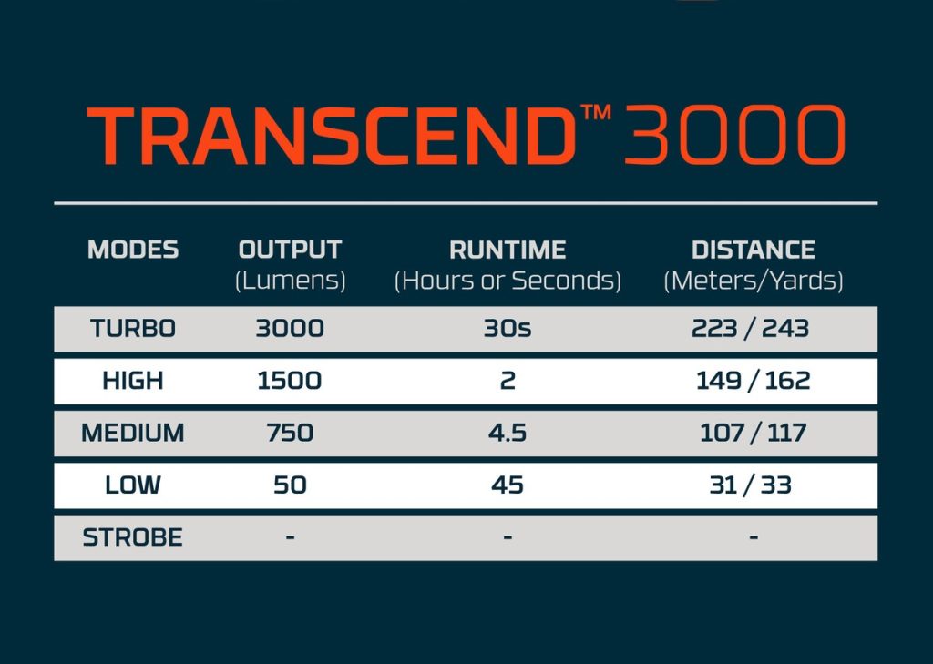 | Turbo (3000 lumens): 30 δευτερόλεπτα* / 223 μέτρα *μετά από 30 δευτερόλεπτα το φως επιστρέφει στη σκάλα που χρησιμοποιήθηκε τελευταία ώστε να αποφευχθεί η υπερθέρμανση και να προστατευτεί η μπαταρία. Η σκάλα Turbo μπορεί να ενεργοποιηθεί ξανά ανά πάσα στιγμή. |