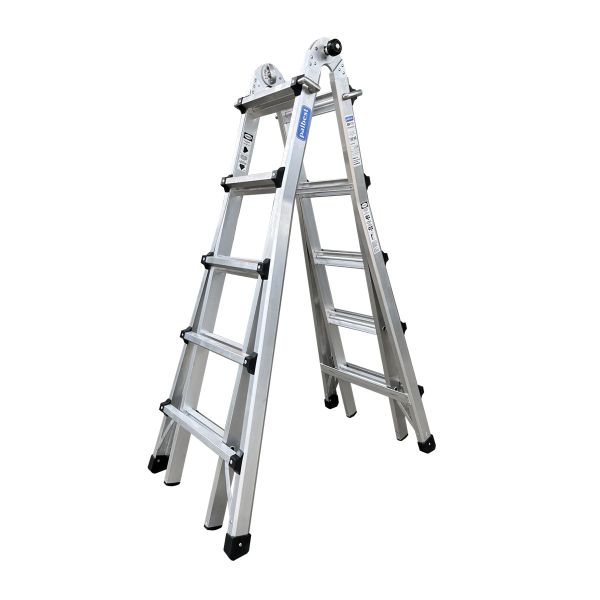 Σκάλα αλουμινίου με 2 αυτόματες ασφάλειες. Δυνατότητα σκάλας να διαμορφώνεται σε 5 διαφορετικές θέσεις κλειδώματος. Χρήση σε ανισόπεδο. Εύκολη στην μεταφορά και αποθήκευση λόγο μεγέθους.Η σκάλα παρέχει όλες τις ευρωπαϊκές προδιάγραφες ΕΝ131 Μέγιστη αντοχή 150kg.