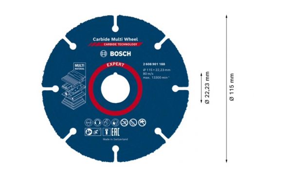 Οι επαγγελματίες εκτιμούν τους γωνιακούς λειαντήρες για την ικανότητά τους να κόβουν σκληρά υλικά, όπως μπετόν, πέτρα και μέταλλο. Με το EXPERT Carbide Multi Wheel, αυτό το εξαιρετικό εργαλείο μπορεί να γίνει ακόμη πιο ευέλικτο, κόβοντας ουσιαστικά κάθε τύπο μαλακότερου υλικού, όπως ξύλο, πλαστικό και σύγχρονα σύνθετα υλικά. Με το EXPERT Carbide Multi Wheel, ο γωνιακός λειαντήρας σας γίνεται ακόμη πιο ευέλικτος. Για πολλούς τεχνίτες, είναι το μόνο ηλεκτρικό εργαλείο που χρειάζονται. Η εξαιρετική ανθεκτικότητα είναι ενσωματωμένη στην Carbide Technology της Bosch. Προηγμένο χαλύβδινο σώμα που διατηρεί σταθερή ταχύτητα και μέλλον. Εξαιρετικά ισχυρή συγκόλληση λέιζερ του κόκκου καρβιδίου και του χαλύβδινου σώματος.