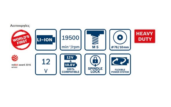 Εύχρηστος σε κάθε περίπτωση - εξαιρετικά συμπαγής και εργονομικός για γρήγορη κοπή στο εργοτάξιο. Πολύπλευρη χρήση σε διάφορα υλικά. Απλή αλλαγή του δίσκου χάρη στο νέο κλείδωμα του άξονα. Γρήγορη ακινητοποίηση του δίσκου. Γρήγορη πρόοδος της εργασίας χάρη στον ισχυρό κινητήρα EC. Ο πρώτος γωνιακός λειαντήρας 12 V. Απλή ρύθμιση του προφυλακτήρα χωρίς εργαλεία. Διαθέσιμη μεγάλη συλλογή εξαρτημάτων για Bosch Professional.