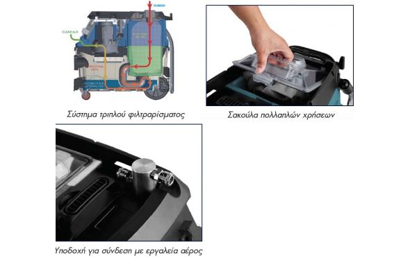 • Σύστημα τριπλού φιλτραρίσματος - Σακούλα (πρώτο στάδιο), Φιλτράρισμα με νερό (δεύτερο στάδιο), Φίλτρο HEPA (Τρίτο στάδιο).