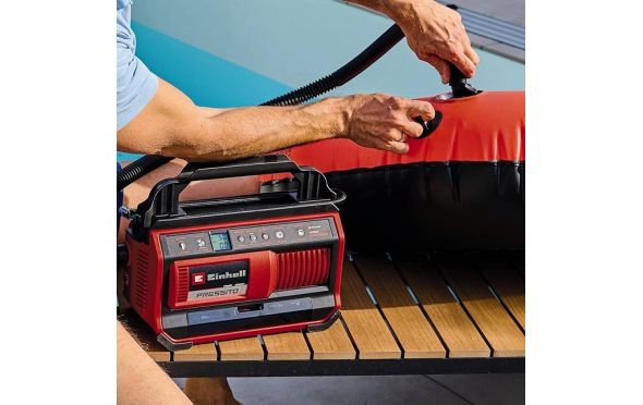 Μέλος της πολυλειτουργικής πλατφόρμας μπαταρίας Power X-Change - Ένας τύπος μπαταρίας για πάνω από 170 διαφορετικά εργαλεία. Υβριδική λειτουργία με ρεύμα ή μπαταρία,. Ψηφιακή οθόνη ένδειξης πραγματικής και επιθυμητής πίεσης δύο γραμμών. Διακόπτης χειροκίνητης επιλογής. Φωτισμός - Για το φωτισμός του χώρου εργασίας (σε λειτουργία μπαταρίας). Αντλία υψηλής πίεσης, αντλία χαμηλής πίεσης και αναρρόφηση χαμηλής πίεσης με μία μόνο συσκευή. Τα καλώδιο ρεύματος και οι σωλήνες αποθηκεύονται. Περιλαμβάνει 5 αντάπτορες για μπάλες, ελαστικά και στρώματα αέρα.