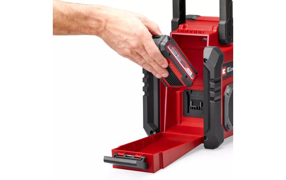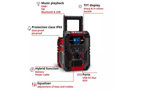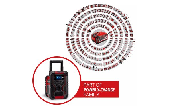 Μέλος της οικογένειας Power X-Change.Υβριδική λειτουργία: Το ραδιόφωνο μπορεί να χρησιμοποιηθεί με μπαταρία ή πρίζα.Οθόνη TFT: ευκρινής, έγχρωμη και με οπίσθιο φωτισμό.30 μνήμες για σταθμούς DAB+ και FM.Λειτουργία αυτόματης αναζήτησης για εύκολη αναζήτηση σταθμών.Λειτουργία RDS: Πληροφορίες για σταθμούς, τραγούδια και κίνηση.Πρόσθετη αναπαραγωγή μουσικής μέσω Bluetooth, AUX ή USB.Ισοσταθμιστής για εξατομικευμένη ρύθμιση μπάσων και πρίμων.Στιβαρή αναδιπλούμενη κεραία για τέλεια λήψη.Ανθεκτικό περίβλημα με πλαίσιο απορρόφησης κραδασμών.Κατηγορία IP65: Προστατεύεται από τη σκόνη και το πιτσίλισμα νερού.Θύρα USB-Out για φόρτιση εξωτερικών συσκευών.Λειτουργία ύπνου για αυτόματη απενεργοποίηση του ραδιοφώνου.2 μεγάλα ηχεία για υψηλή ποιότητα στερεοφωνικού...