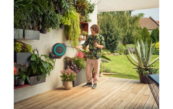 - Άνετο και ευέλικτο πότισμα μεσαίου μεγέθους κήπων με το συμπαγές Αυτόματο Καρούλι Λάστιχου RollUp M.