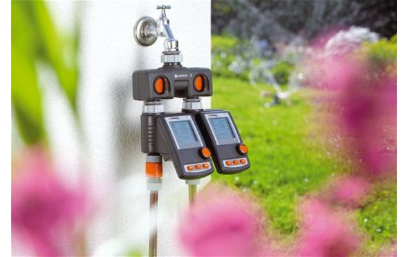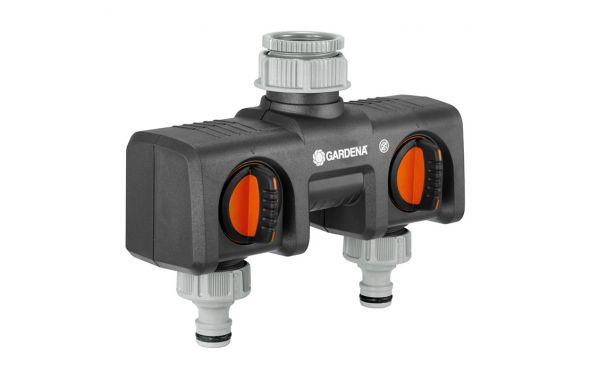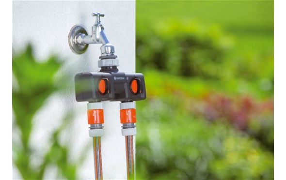 - Με τη διπλή παροχή της GARDENA είναι εφικτή η ταυτόχρονη σύνδεση δύο ποτιστικών συσκευών σε μία βρύση. Οι έξοδοι είναι πλήρως ρυθμιζόμενες. Μπορείτε να συνδέσετε σε αυτές δύο προγραμματιστές αυτόματου ποτίσματος GARDENA.