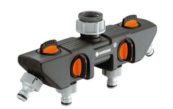 Η τετραπλή παροχή της GARDENA καθιστά δυνατή την ταυτόχρονη σύνδεση διαφόρων ποτιστικών συσκευών σε μία βρύση. Η ροή νερού μπορεί να ρυθμιστεί ξεχωριστά ή να απενεργοποιηθεί για κάθε έξοδο.