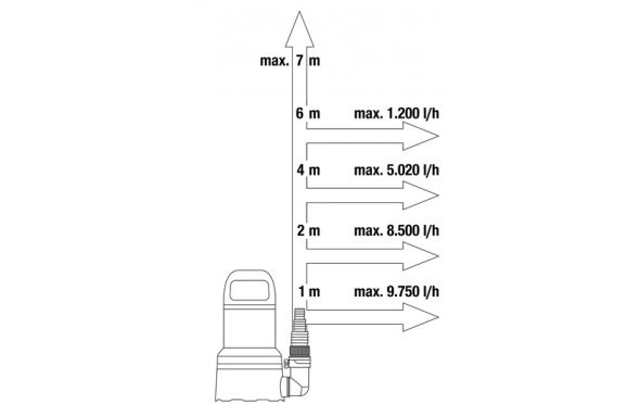 - Ο κινητήρας παρέχει ισχύ 450 W με μέγιστη πίεση 0,7 bar και βάθος βύθισης έως 7 m, μπορεί να αντληθεί έως 11000 λίτρα νερού ανά ώρα.