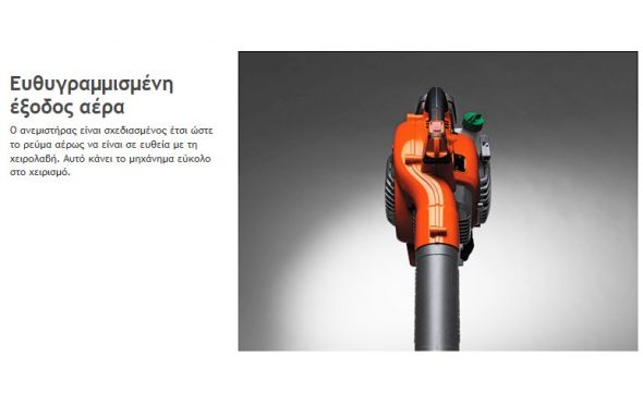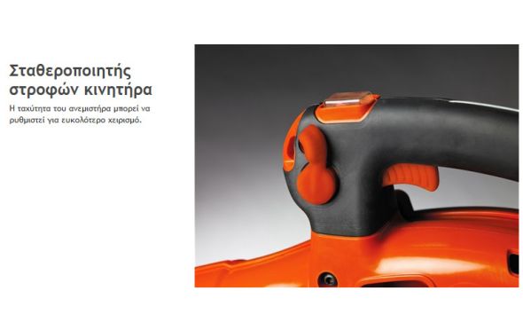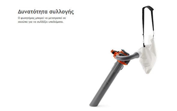 Φυσητήρας υψηλής ισχύος Σχεδιασμένος ώστε να μην υπάρχουν δυνάμεις αντίδρασης στο χέρι του χειριστή Εύκολος στην χρήση Σταθεροποιητής στροφών Συνοδεύεται απο ίσιο και πεπλατυσμένο ακροφύσιο Συνοδεύεται και από πεπλατυσμένο ακροφύσιο για μεγαλύτερη ταχύτητα αέρα Σταθεροποιητής στροφών για ευκολότερο χειρισμό Σύστημα εύκολης εκκίνησης Smart Start® Δυνατότητα αναρρόφησης με λεπίδες ψιλοτεμαχισμού του εισερχόμενου υλικού στον σάκο συλλογής Κιτ αναρρόφησης