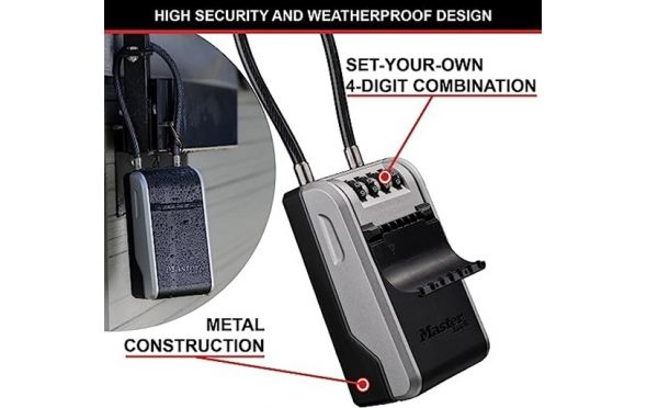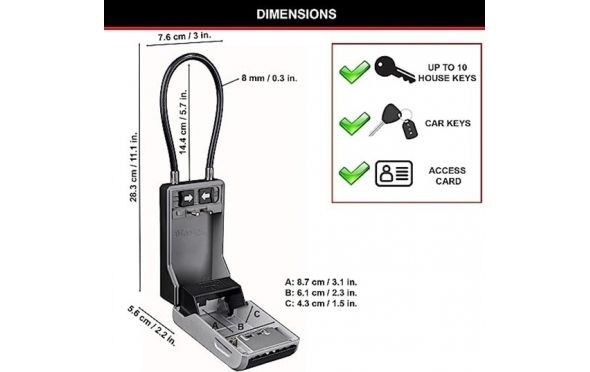 Εξαιρετική λύση για ιδιοκτήτες Airbnb και ενοικίαση σπιτιού. Παρέχει εύκολη πρόσβαση σε φροντιστές και κατ' οίκον εργαζόμενους. Ιδανικό για να μοιράζεστε τα κλειδιά με την οικογένεια ή τους συγκατοίκους σας. Στιβαρή κατασκευή με ανθεκτικό μεταλλικό σώμα Μεγαλύτερη χωρητικότητα αποθήκευσης Ρυθμίστε τον δικό σας 4ψήφιο συνδυασμό (περισσότεροι από 10.000 πιθανοί συνδυασμοί) Εύκαμπτος λαιμός 135mm x O 8mm (ιδανικό για χρήση σε διαφορετικές τοποθεσίες και ο λαιμός είναι εύκολο να προσαρτηθεί παντού) Πλαστικό κάλυμμα προστασίας από τις καιρικές συνθήκες