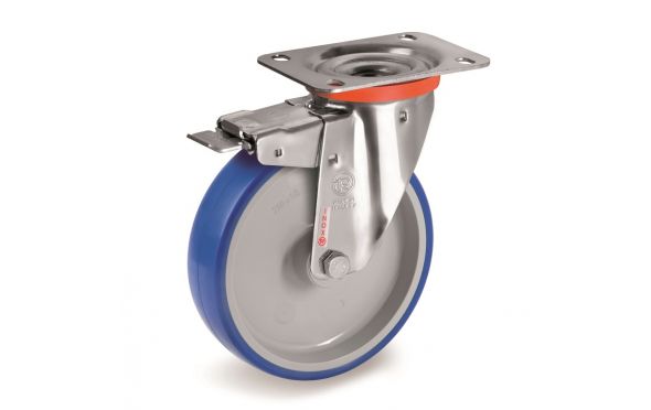 Κατάλληλο για καρότσια και τα μηχανήματα με τα φορτία μεσαίου βαθμου, Κατάλληλο για εσωτερική και εξωτερική χρήση για συχνό πλύσιμο και αποστείρωση.Εξαιρετική αντίσταση κύλισης.Παραδείγματα συνιστώμενες εφαρμογές: καρότσια για βιομηχανική χρήση σε εσωτερικούς χώρους, σωληνοειδή καρότσια, καρότσια για τη βιομηχανία τροφίμων και χημικών.ΡΟΔΑ:Θερμοπλαστική πολυουρεθάνη.ΠΕΛΜΑ:INOX