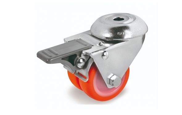 Κατάλληλο για χρήση σε διαφορετικούς τύπους καροτσιών, ιδίως στο χώρο της εστίασης.Καλή ικανότητα μεταφοράς φορτίου σε σχέση με τροχούς μικρής διαμέτρου.Πέλμα:θερμοπλαστική πολυουρεθάνη.Κέντρο: πολυαμίδιο.Βάση: γαλβανιζέ.