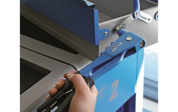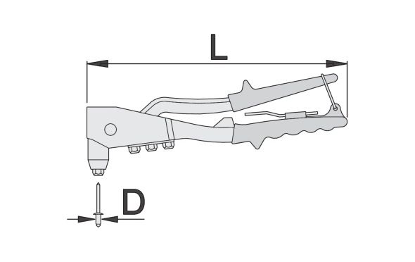 Υλικό: σκελετός από παράγωγο αλουμινίου, χειρολαβή υπομοχλίου από ειδική σύνθεση ατσαλιού Χειρολαβή: εργονομικό σχήμα Ελατήριο επαναφοράς Πλήρες με τέσσερις μύτες για την τοποθέτηση πριτσινιών έως 4, 8mm ή 3/16" Με κλειδί για την τοποθέτηση των μυτών