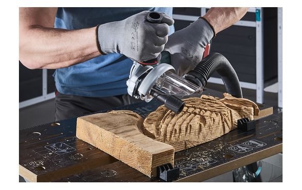 - Για τη βέλτιστη δυνατή ασφάλεια κατά την εργασία πρέπει ο δίσκος φρεζαρίσματος να χρησιμοποιείται πάντα με το κάλυμμα αναρρόφησης της wolfcraft (κωδ. προϊόντος 439900).