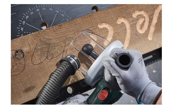 - Στη σύνδεση ηλεκτρικής σκούπας μπορείτε να συνδέσετε οποιαδήποτε κοινή ηλεκτρική σκούπα, προκειμένου να απορροφήσει τη βλαβερή για την υγεία σκόνη που δημιουργείται κατά την κατεργασία ξύλου.